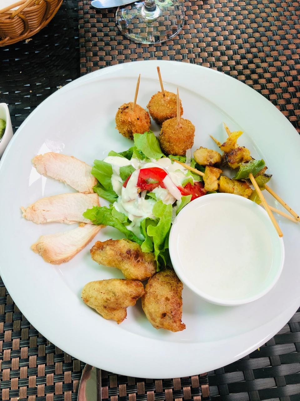 - Main Course: Mauritian Discovery Plate – Fish in coconut milk & turmeric with Creole chicken sausage rougaille OR Vegetarian version (vegetable kofta & seasonal vegetable curry in coconut milk) + traditional sides